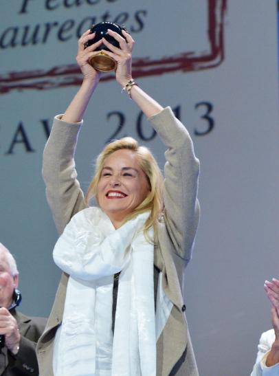„Esminio instinkto“ žvaigždė statulėlę atsiėmė per 13-ąjį Nobelio taikos premijos laureatų susitikimą, vykusį Lenkijos sostinėje.