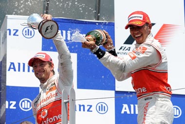 komandos pilotas L.Hamiltonas, už jo finišavo komandos draugas J.Buttonas.