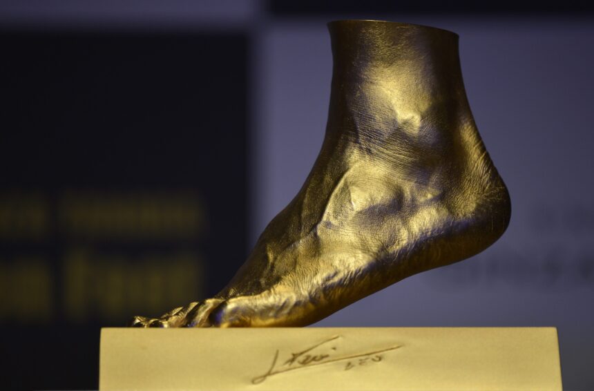 Vienas Japonijos juvelyras iš gryno aukso pagamino futbolo žvaigždės Lionelio Mesio kairės kojos kopiją. Dalyvaujant futbolininko broliui Rodrigui, japonas Ginza Tanaka trečiadienį savo meno kūrinį atidengė per spaudos konferenciją Tokijuje.