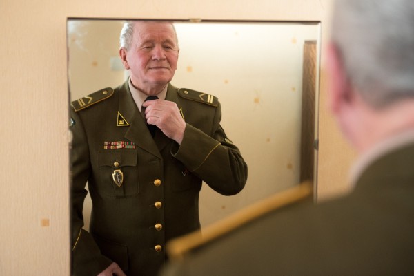 Per šventes Lietuvos laisvės gynėjas R. Stakė visada pasipuošia karine uniforma, prisisega apdovanojimus. U. Mikaliūno nuotr.