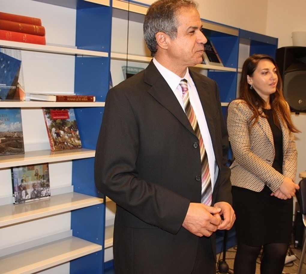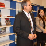Kupiškio žydų palikuonys uždega žvakutes prie savo sušaudytų protėvių atminimo lentos Kupiškio viešojoje bibliotekoje. Pirmas iš kairės – Normanas Mejeris, dešinėje – Harvis Šerzeras. KUPIŠKIO ETNOGRAFIJOS MUZIEJAUS ARCHYVO nuotr.