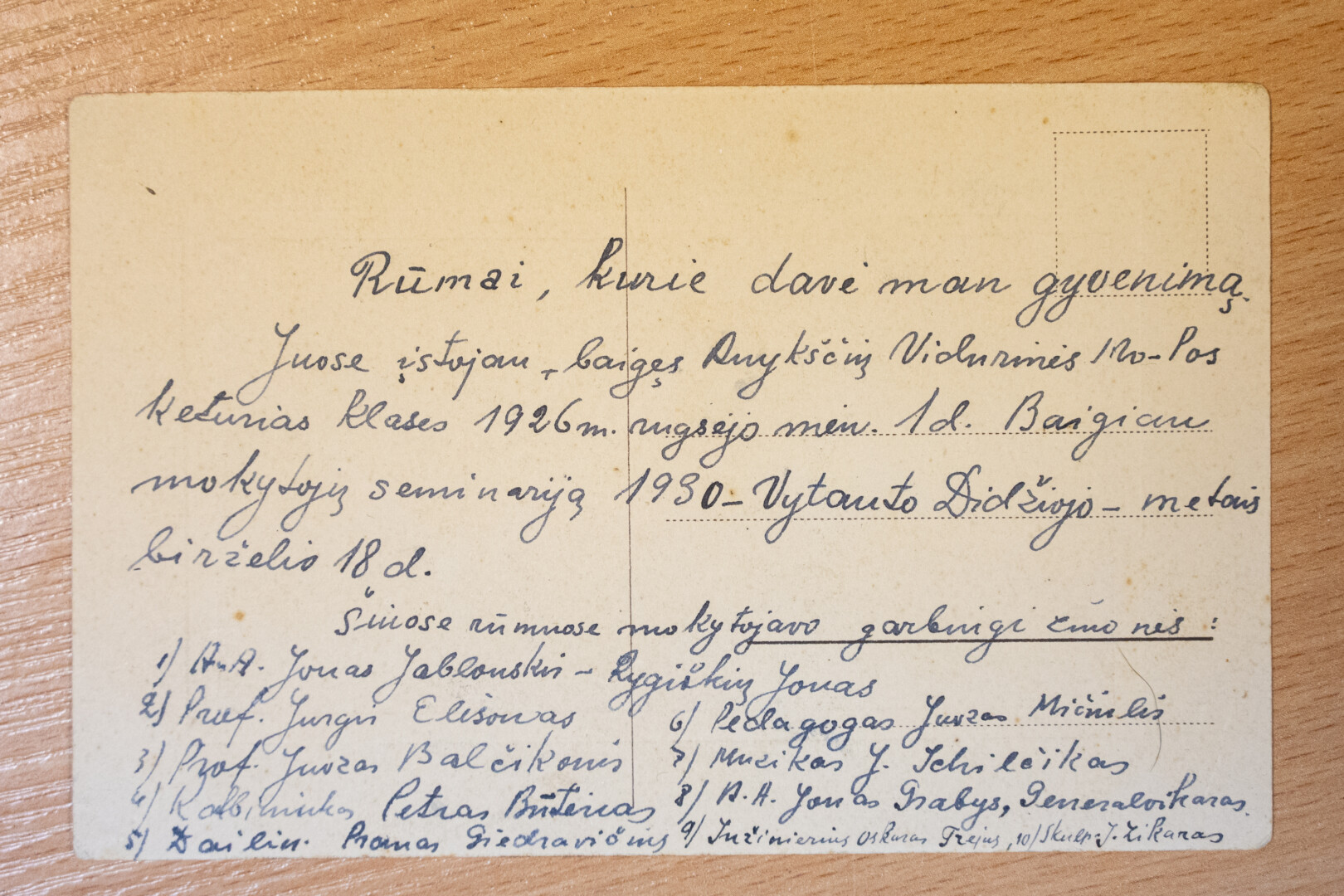 Pasak pašnekovės, galima spėti, kad atviruką užrašė mokytojų seminarijos mokinys, vėliau tapęs mokytoju.
