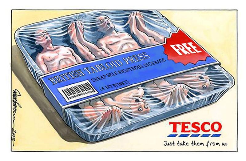 Britams paskelbus karikatūrą apie lietuvių emigrantus, kurioje jie prilyginami pigiai mėsai iš Rytų Europos, lietuviai smogia atgal. Socialiniame tinkle “Facebook” pradėjo plisti analogiška karikatūra paskelbtai britų laikraščio “The Independent”, kurioje pasišaipoma iš britų bulvarinės spaudos.