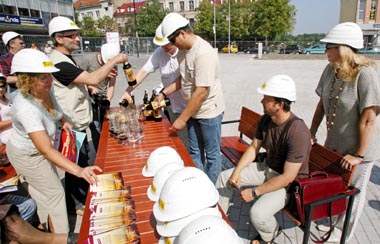 „Butautų dvaro gira” ir dėvint statybininkų šalmus jos organizatoriai