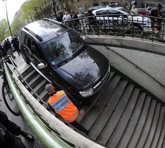 Vairuotojas, sumaišęs požeminę automobilių stovėjimo aikštelę su Prancūzijos sostinės Paryžiaus metro stotimi, pastatė savo automobilį ant laiptų į metro stotį.