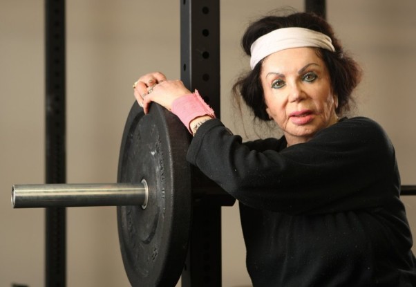 Senolė per treniruotes sportuoja su irklavimo treniruokliu, žiedais, medicininiu kamuoliu ir net atsigulusi ant suoliuko kelis kartus išspaudžia štangą, rašo tmz.com.