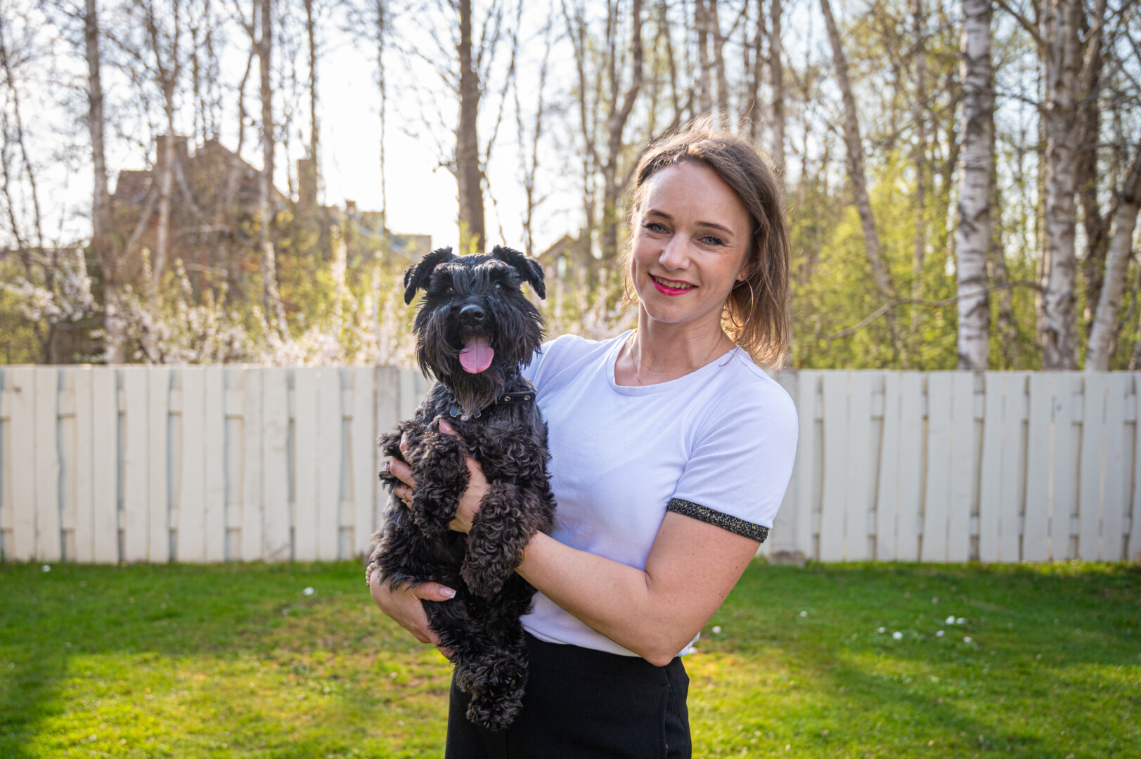 O abu šunys vokiečių aviganiai. Viena irgi priglausta. Šeimininkai kaime mirė ir liko gyvūnas beglobis, pamatę feisbuke, kad ieško šuneliui namų, nuvažiavome pasiimti. Kitą pirkome iš veislyno. Dabar mūsų Aryja dalyvauja parodose, lanko dresūros pamokas, jai reikia ir egzaminus laikyti – rūpesčių nemažai, bet labai gera, kai yra kuo rūpintis.