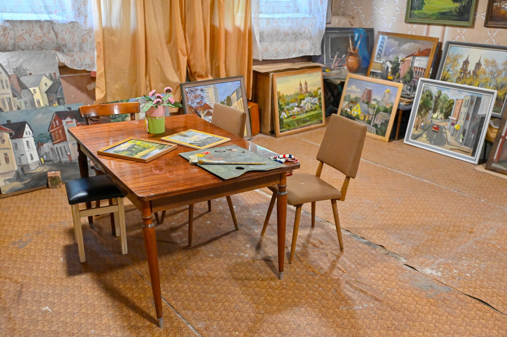 Menininkų namuose ir rūsyje įkurtose dirbtuvėse sukrauta daugybė per kelis dešimtmečius sukauptų darbų.