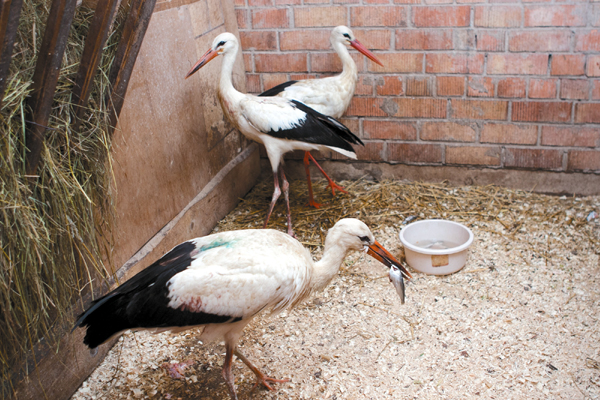 Gamtos mokyklos tvartelyje prieglobstį radę trys baltieji gandrai lepinasi darbuotojų iš prekybos centrų parūpinta žalia mėsa – plaučiais ir šaldytomis strimelėmis.