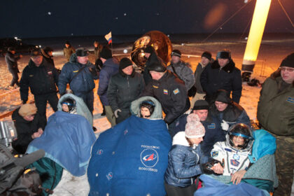Kosminio laivo “Sojuz TMA-05M” nuleidžiamasis aparatas su trimis Tarptautinės kosminės stoties (TKS)…