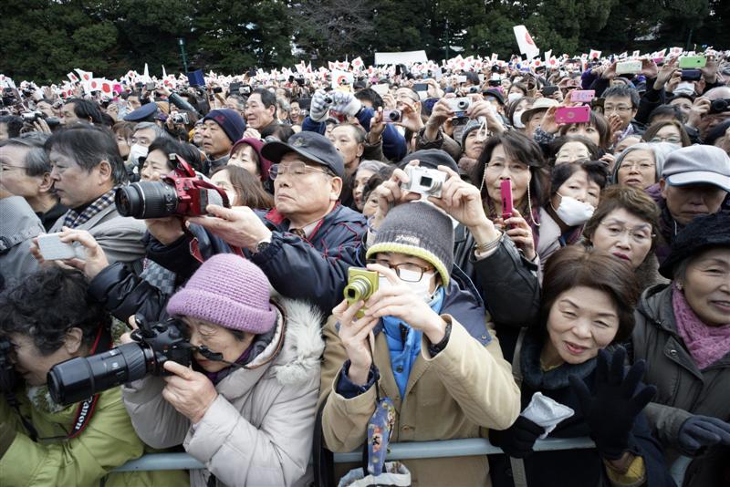 Japonai tik du kartus gali patekti į rūmų teritoriją: gruodžio 23-iąją, kai Akihitas švenčia savo gimimo dieną, ir sausio 2-ąją – Naujųjų metų proga. Prie įėjimo į rūmų teritoriją visi svečiai kruopščiai tikrinami. Po to jiems išdalijamos vėliavėlės su raudonos tekančios saulės atvaizdu baltame fone. Jomis mojuodami pavaldiniai sveikina imperatorių, kuriam pernai sukako 81 metai.