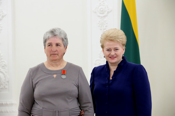 Vienuolika vaikų pagimdžiusios ir užauginusios naujamiestietės Bronislavos Židonienės krūtinę ordino „Už nuopelnus Lietuvai“ medaliu papuošė pati prezidentė.