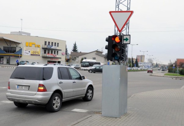 Nuo šiol degant draudžiamam šviesoforo signalui, bet esant žaliai papildomai rodyklei prieš sukdami į dešinę vairuotojai privalo sustoti ir įsitikinti, kad važiuoti saugu, o po šešerių metų tokių rodyklių neturėtų likti visai. U. Mikaliūno nuotr.