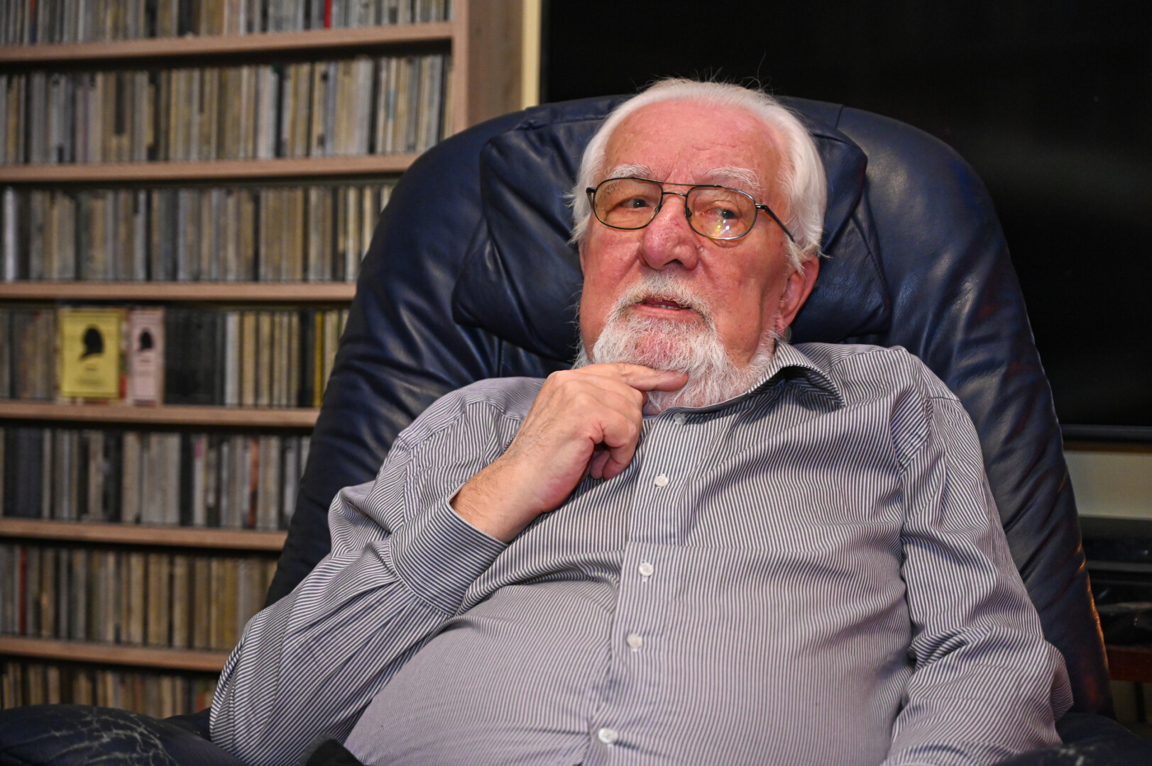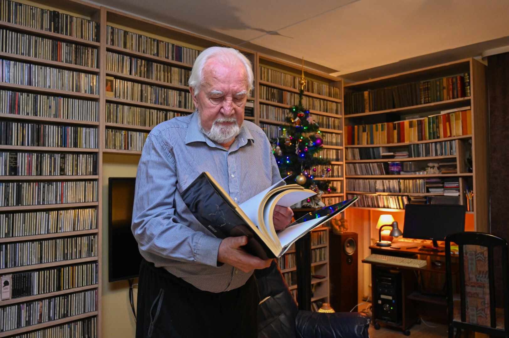 Muzikologo kambario sienas dengia įspūdinga, maždaug 10 tūkstančių kompaktinių diskų kolekcija.
